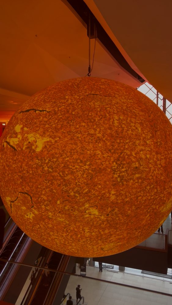 Pameran itu menampilkan arca sfera gergasi yang diterangi dari dalam serta dibalut dengan imejan resolusi tinggi permukaan matahari.