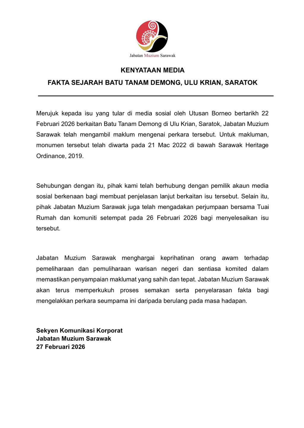 Media Statement: Historical Facts about Demong Planting Stone, Ulu Krian, Saratok